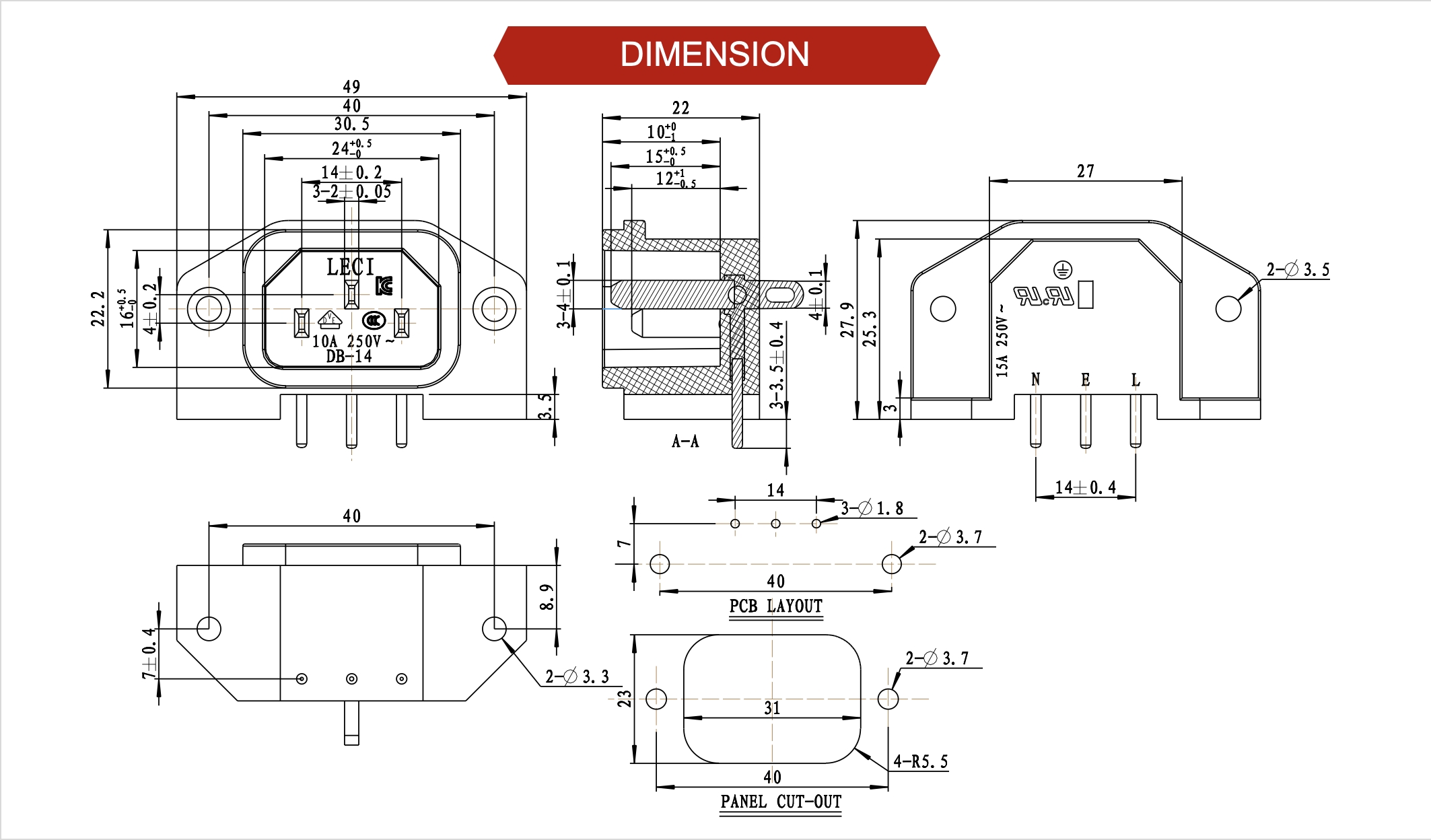 端子塑胶之间3750VAC (50-60Hz) 1 min