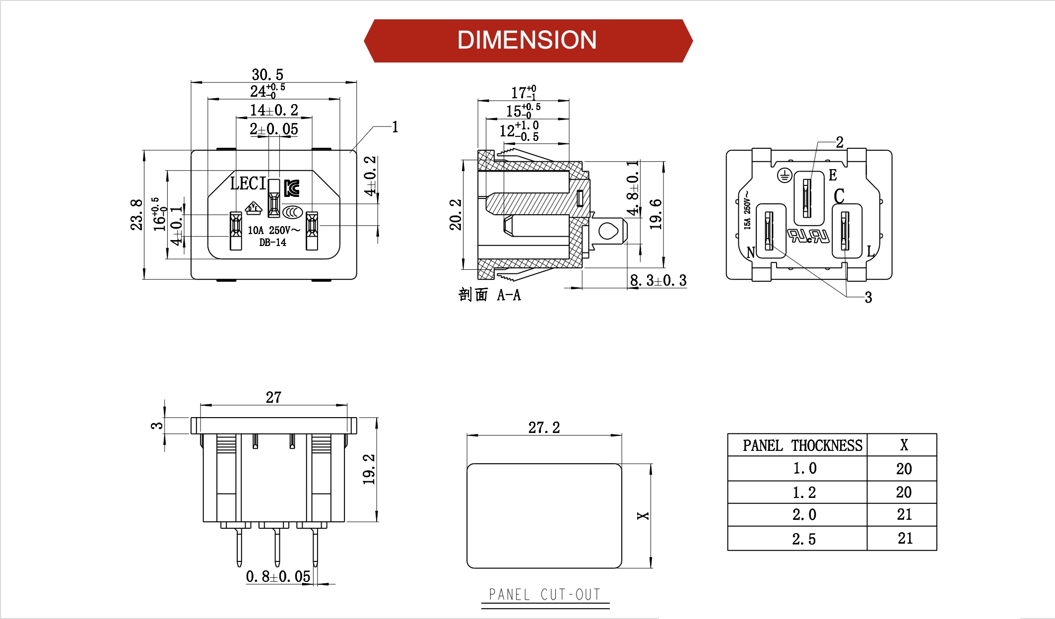 端子塑胶之间3750VAC (50-60Hz) 1 min
