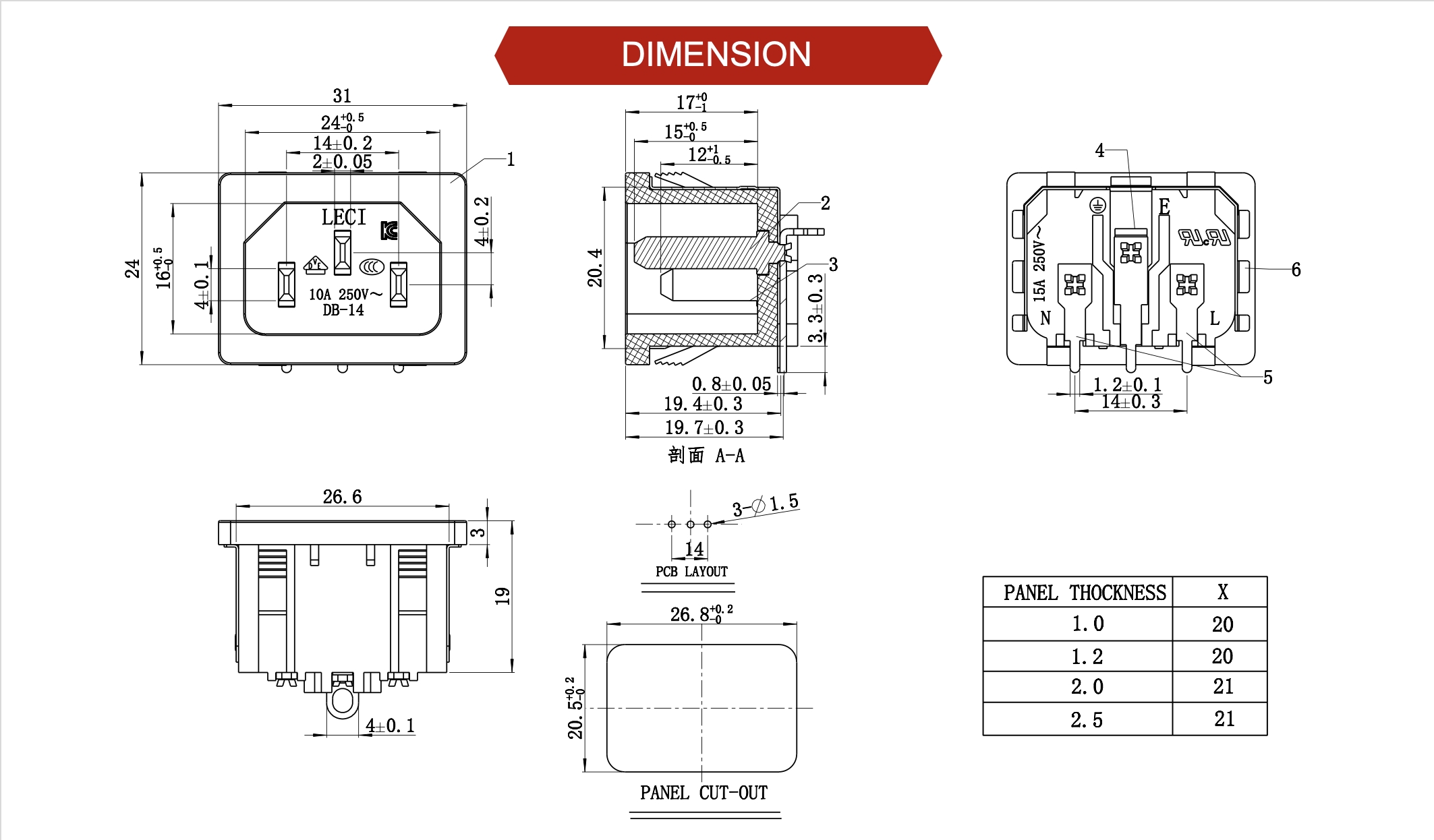 端子塑胶之间3750VAC (50-60Hz) 1 min