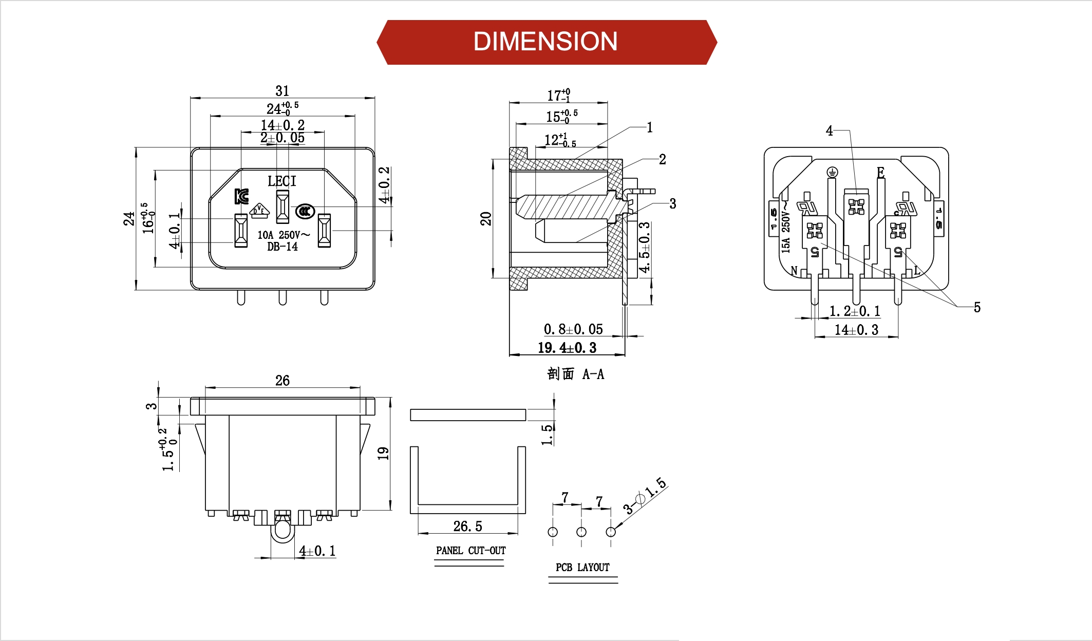 端子塑胶之间3750VAC (50-60Hz) 1 min