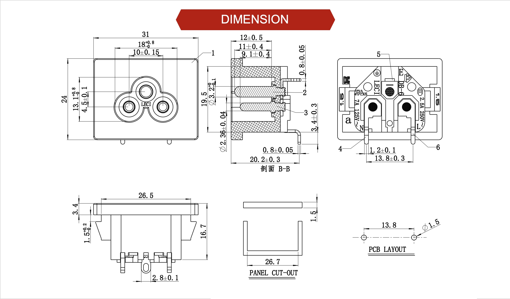 端子塑胶之间3750VAC (50-60Hz) 1 min