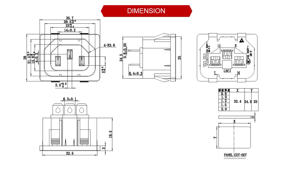 端子塑胶之间3750VAC (50-60Hz) 1 min